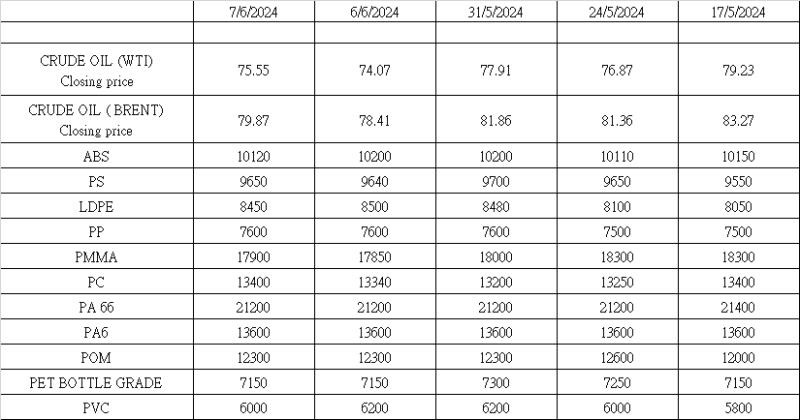 2024年6月7日現在のプライム、リサイクル、スクラッププラスチックの市場更新情報です。