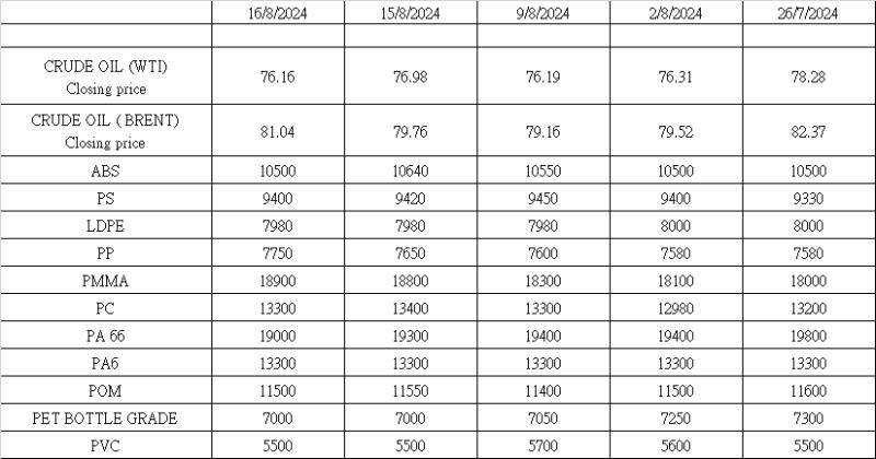 2024年8月16日現在のプライム、リサイクル、スクラッププラスチックの市場更新情報です。