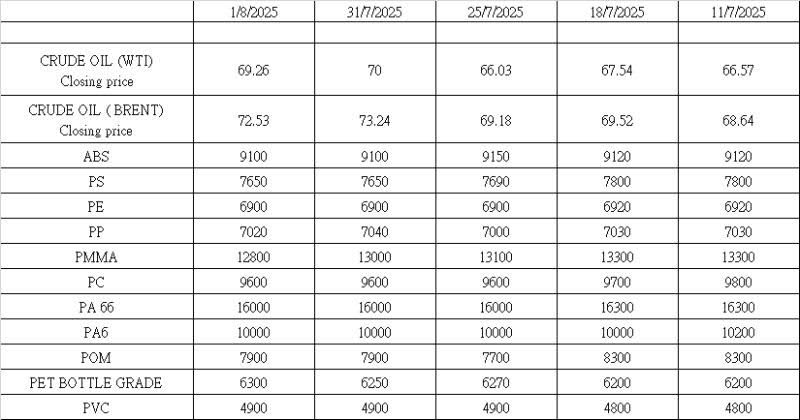 2025年8月1日現在のプライム、リサイクル、スクラッププラスチックの市場更新情報です。