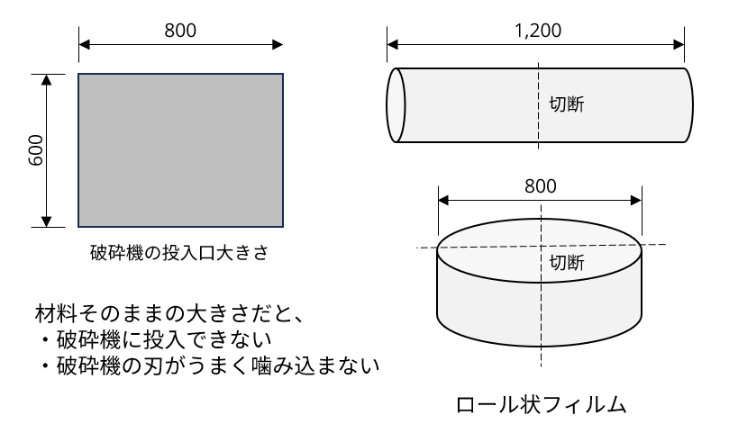 プラスチックリサイクルなどにおいて、材料が大きすぎると、1次処理を行う破砕機に投入することができず、加工を行えません。