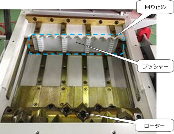 これにより回転刃への食い込みが効率的に行われます。様々な樹脂に対応でき用途が広い理由はプッシャーにあります。