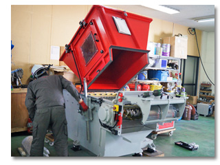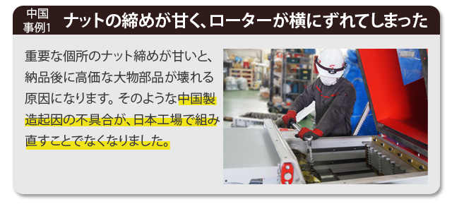 私達はこのようなトラブルが根本から起こらないようにするため、中国で組立てた粉砕機を日本工場で半バラしにし、日本の技術者が責任をもって組立てています。