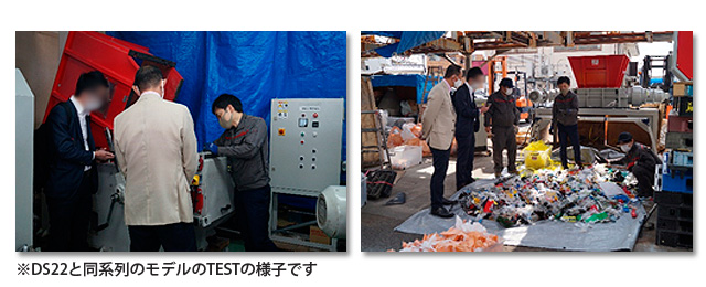 破砕機の説明はもちろん、実際に破砕している様子、破砕後の状態を確認できます。また導入した場合のスクリーンの選定や、付属品など、導入時に必要なことをお客様に合わせてアドバイスさせて頂いています。実際にテストしてみて分かることも沢山あります。テストで出てきた不明点を解決し、スムーズにドラゴンシュレッダーDS22を導入していただくため、導入前テストをオススメしています。