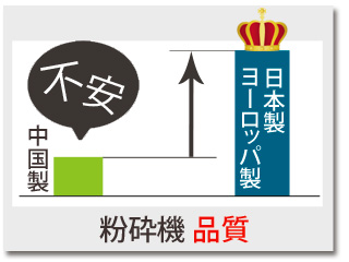 14年間に亘り、中国製粉砕機を取り扱い、様々なトラブルに対応してきました。それを一つ一つ丁寧に調査検討し、ユーザーの元でトラブルを起こさないよう受入れ体制を整えてきた今、中国製粉砕機をほぼ日本製造品質にまですることができました。