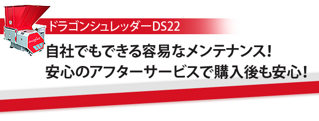 海外の機械で困ることの一つにのは部品を交換したい時に直ぐに納品されないこと。飛行機で輸送すると高いし、船で輸送すると何ヶ月もかかる場合があります。ドラゴンシュレッダーDS22は全パーツを日本の工場で完備!困った時、必要な時には直ぐ納品できます!