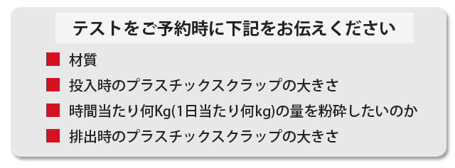 テストのご予約後、テストしたいプラスチックスクラップをお送りください。またその時に下記をお伝えください。