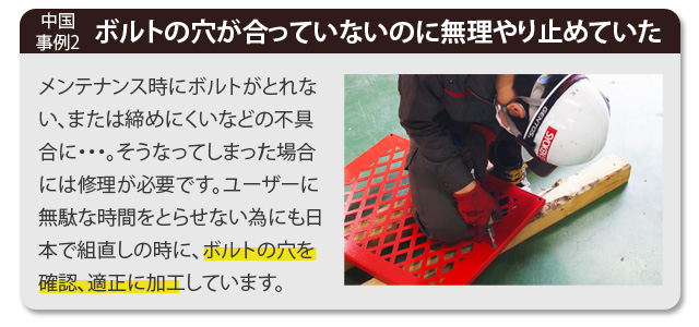“中国で使用されている部品”の品質自体がトラブルの原因になっていることも少なくありません。そのような場合は、新品であっても、部品ごと日本製部品に交換して出荷します。例えば『高い負荷がかかると弱い中国製のボルト』や『故障の多い電磁弁』などを日本製に交換しています。