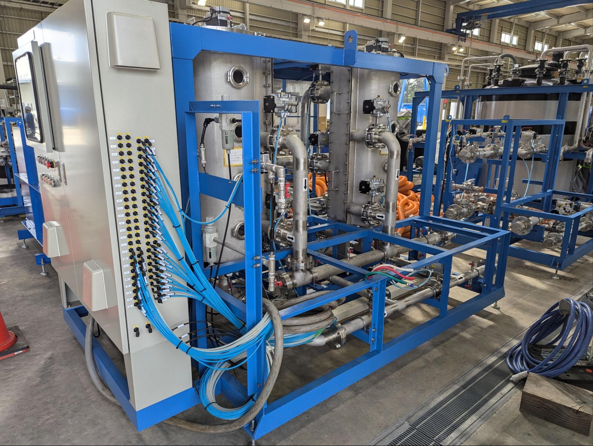 こちらが実物の10t/hの処理能力を持つ水処理装置ですが、10tトラック2台で運べるように構成されています。