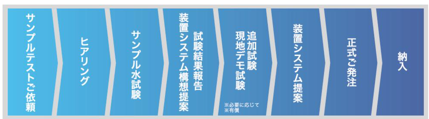これらの汚れに順応するためには、様々な水処理方法の組み合わせのパターンを準備していなくてはなりません。必ずサンプル水をいただきテストを重ね、処理方法の有効性を確認してから機器の組み合わせをオーダーメイドで個社ごとに検討します。