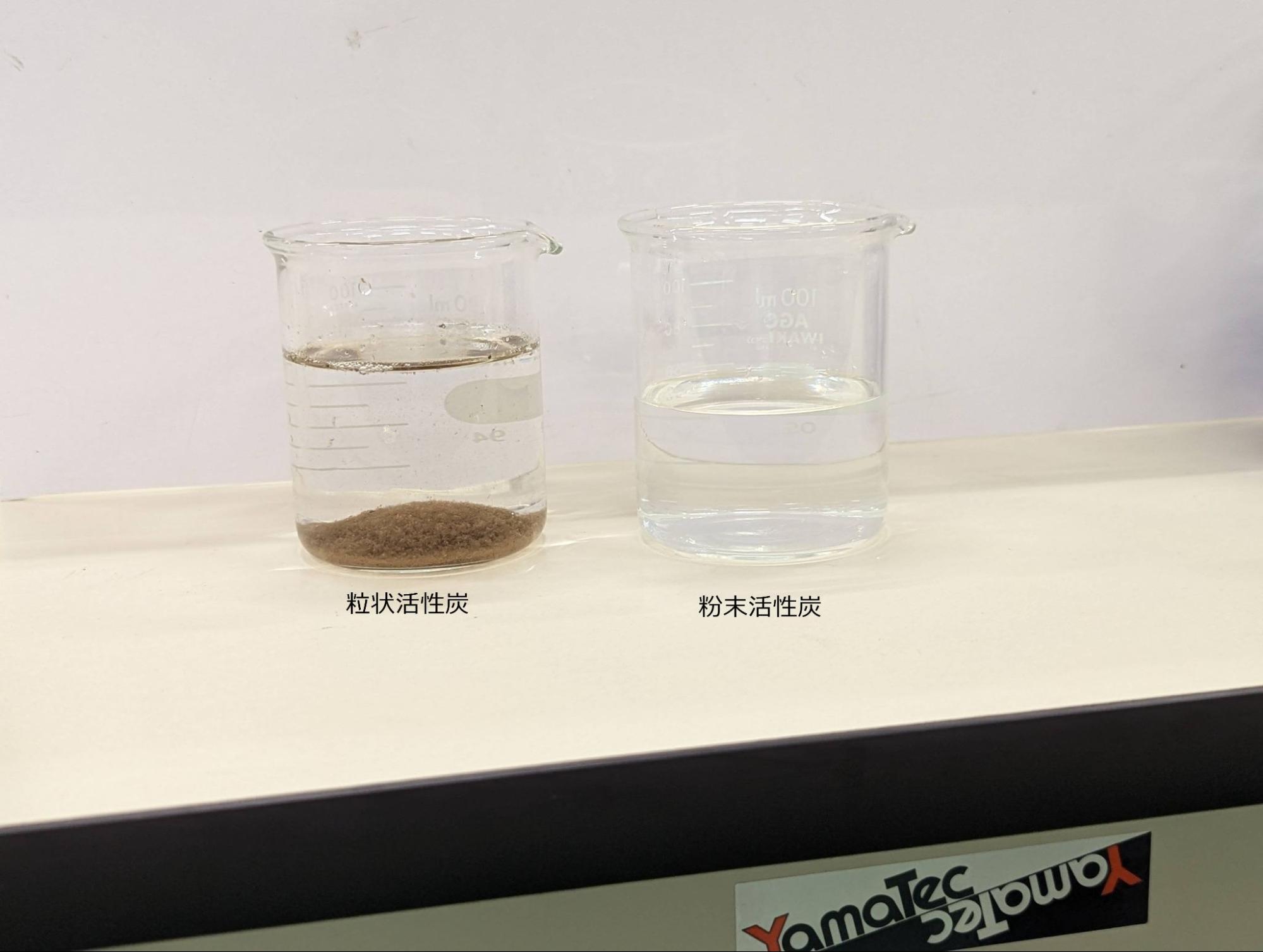 500グラムの粒状活性炭で濾過したのが左で右は粉末の活性炭です。