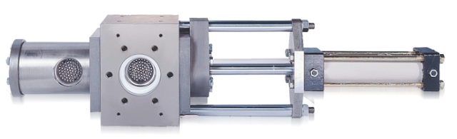 プラスチックリサイクルの造粒の工程で、樹脂のなかに混ざった異物をろ過する網状のスクリーン(金属製)を入れます。このスクリーンが異物で詰まったときに、網替えを一部機械がサポートしてくれるのがスクリーンチェンジャーです。