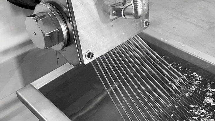 ストランドカット方式とは、ダイに開いている丸い穴から溶融樹脂を押出してからすぐに水槽に入れて冷却する。