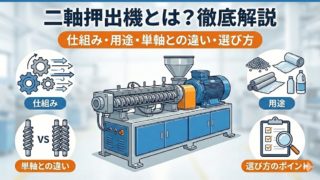 押出機のなかで、スクリューが二本ある押出機のこと。二本のスクリューは様々なスクリューのコマで組み合わせることができるので、スクリューが一本の一軸押出機に比べて圧倒的に練り込みや様々な目的に合わせてアレンジが可能になります。