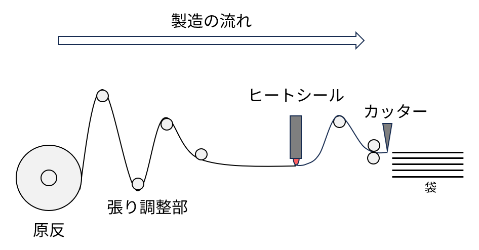 プラスチック袋を作る例では、プラスチックフィルムのロールを取り出し、テンションを調整し、ヒートシールやカットなどの工程を経て袋を製造します。