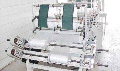 製袋機とは、字のとおり袋を製造する機械です。プラスチック袋の場合、ロール状のプラスチックフィルムから、巻き出し、ヒートシール、カット、スリット、スタッキングなどの一連の作業を経て製品を作ります。他には不織布や紙袋の製袋機もあります。