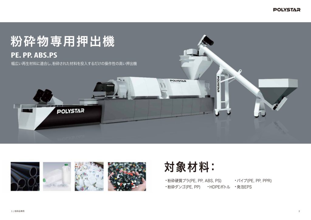 粉砕専用となります。 粉砕であればですねPE 、PP、 ABS 、PSだろうが、例えばポリカーボネードであろうが大概の樹脂汎用樹脂であれば問題なくペレタイズすることができます。