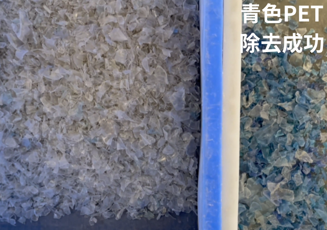 PETフレークからPVCや着色ラベル片を除去し、バージン材に近い品質を実現します