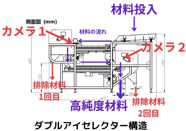 色彩選別機ダブルアイセレクターは、高速カラーカメラと高度なアルゴリズムを用いて、素材の色差や形状を瞬時に判別し、エアー噴射によって異物を弾き飛ばす装置です