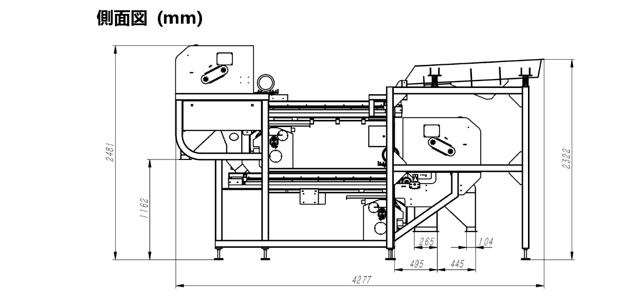 • 全高 2,481mm: 上部ホッパーから二段選別を経て下部排出まで、落差を利用した効率的なマテリアルフローを実現します