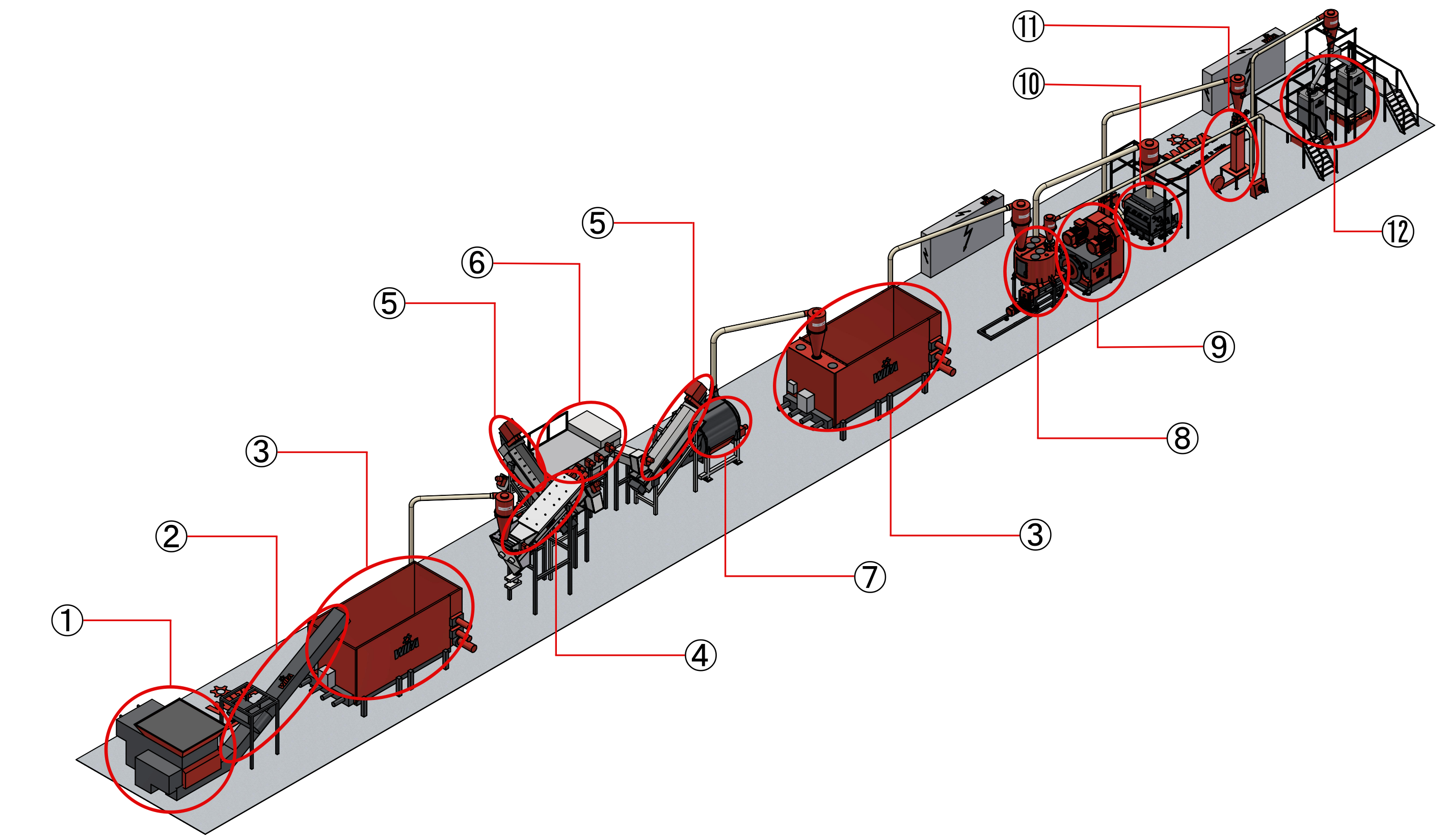 しかし、上記1.の効率的な洗浄効果を伴ったWIPA社の機械は、その台数は少なくて済み、他社比で2/3程度の機械台数で済みます。(スクラップの状態によります)