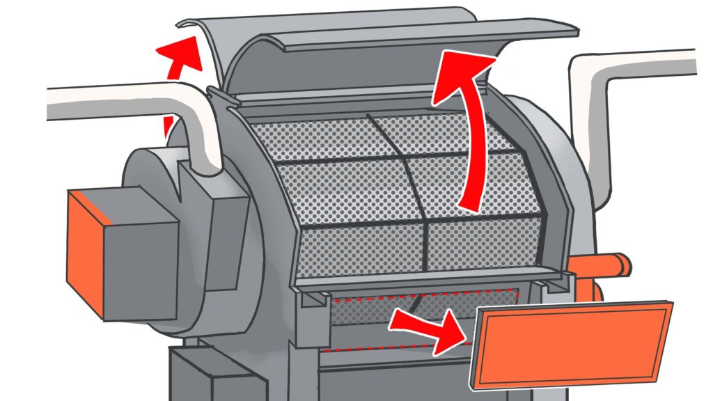 → 安定的な洗浄効果を維持するためにスクリーンと外部カバーの内側部分は継続的に3枚のスクレーパーで洗浄されます。