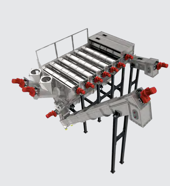 石やガラスなどの小さなコンタミは、時間制御バルブシステムを介して排出されます。ワイヤなどの大きく不定形なコンタミはドラッグチェーンコンベヤが排出に使用されます。