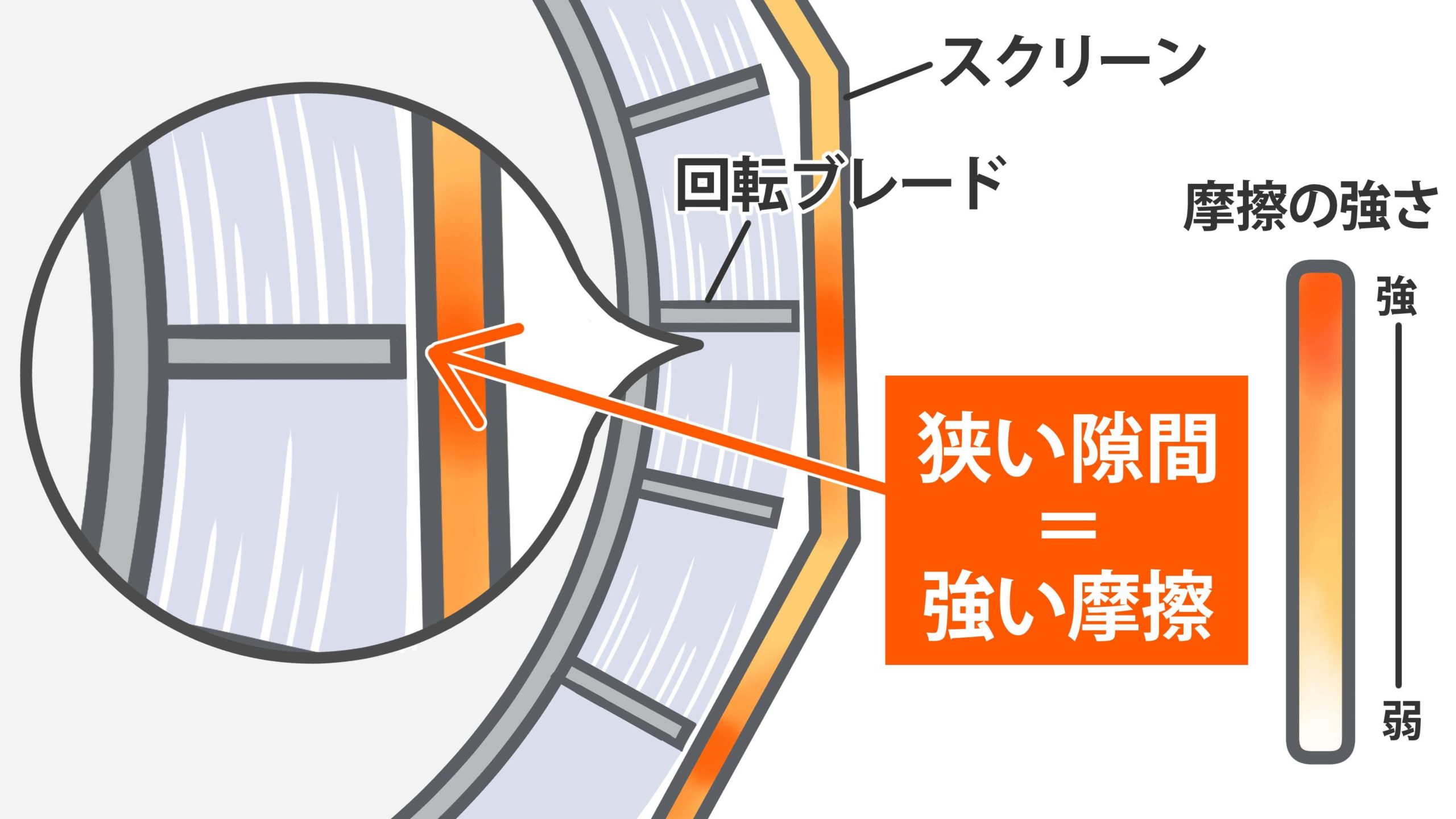 高速で回転するブレードの衝撃と遠心力が異物や汚れを金属メッシュの外に排出します。
