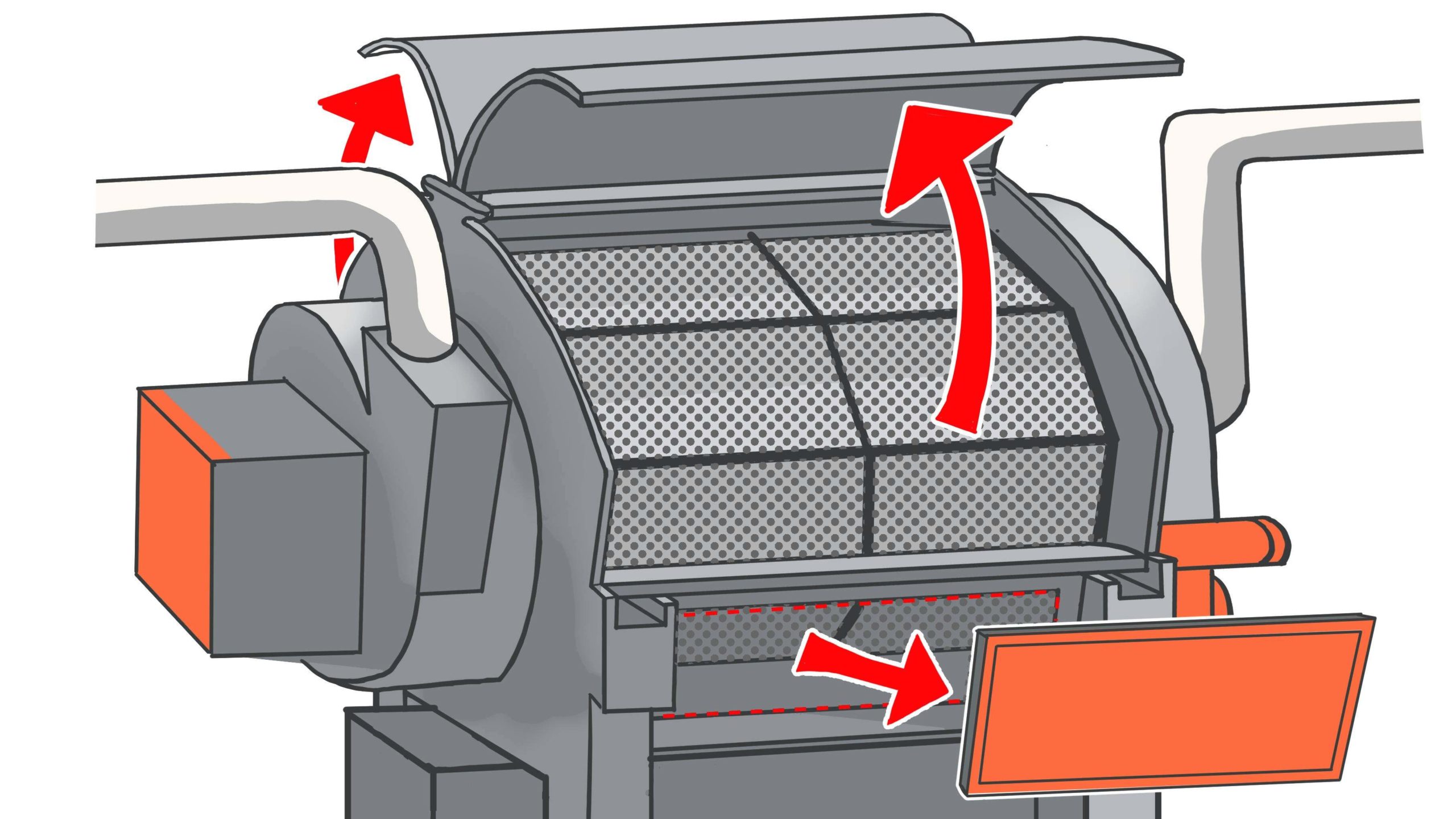 機械に材料が投入された後、材料は高速回転により急激に加速されます。紙の繊維、砂、有機物、付着した水などの異物はスクリーンバスケットの金属メッシュの穴から押し出されます。処理を安定させるため、スクリーンバスケット(金属メッシュ)は継続的に自動洗浄されます。(以下に3D動画あります)