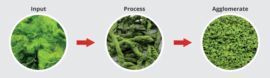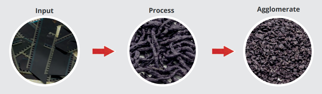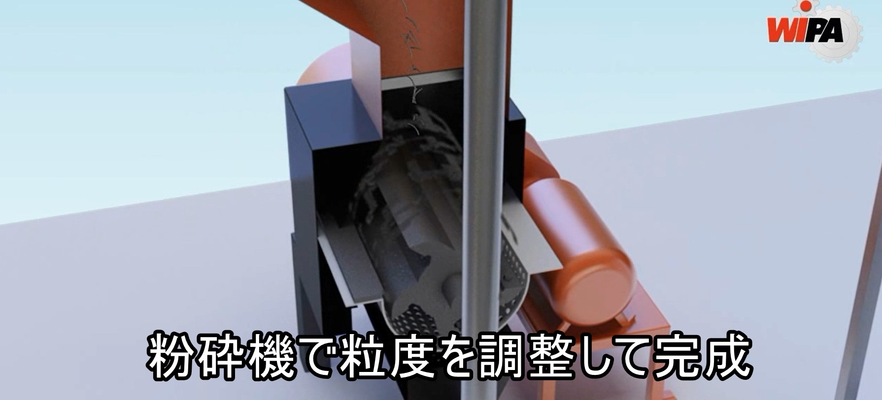 WiPaプラスチック減容機はかさ密度の低いプラスチックを、熱による損傷を最小限に抑えながら、かさ密度が高く効率よく次工程へ投入できる造粒(凝集体)に加工して処理します。