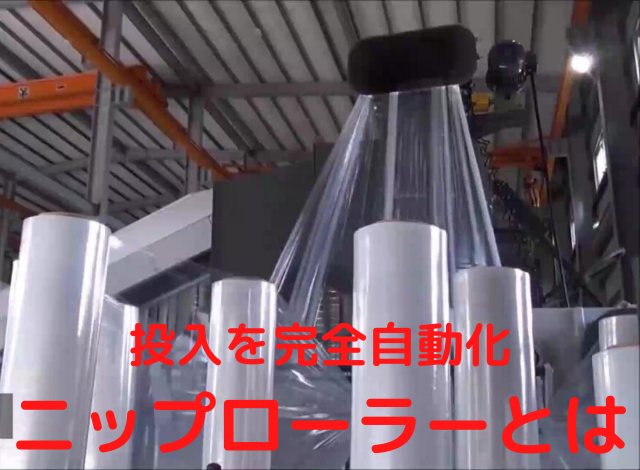 ニップローラーは、フィルムのスクラップを自動供給することができる装置です。ローラーの回転数は、押出機のカッターコンパクターの内部の負荷を検知して自動制御されます。
