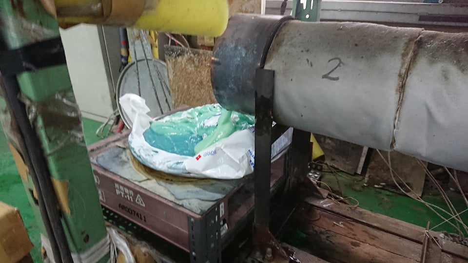 現場を見せていただいたところ、何とお手製の押出機で発泡PEを溶融していました。