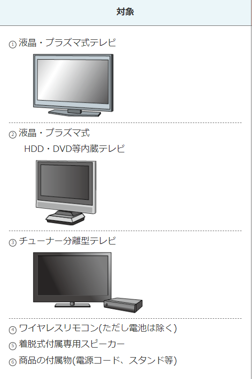その他、ワイヤレスリモコンや電源コードなど商品の付属物も対象となります。