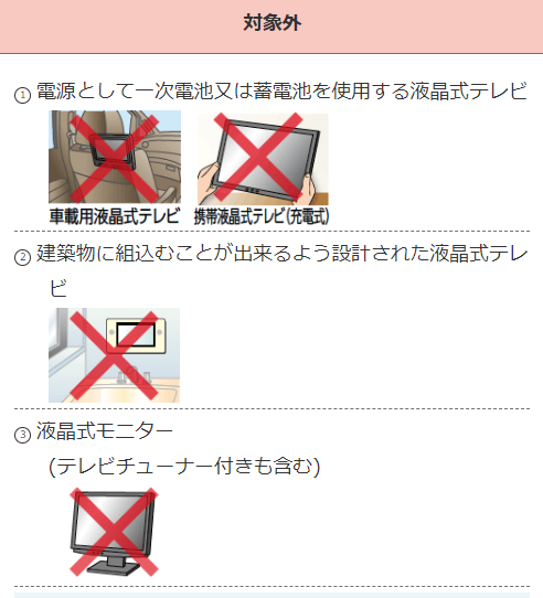 一方で、乾電池といった一次電池や蓄電池を使用する液晶式テレビや建物に組み込むように設計されたもの、液晶モニターなどは対象外となります。