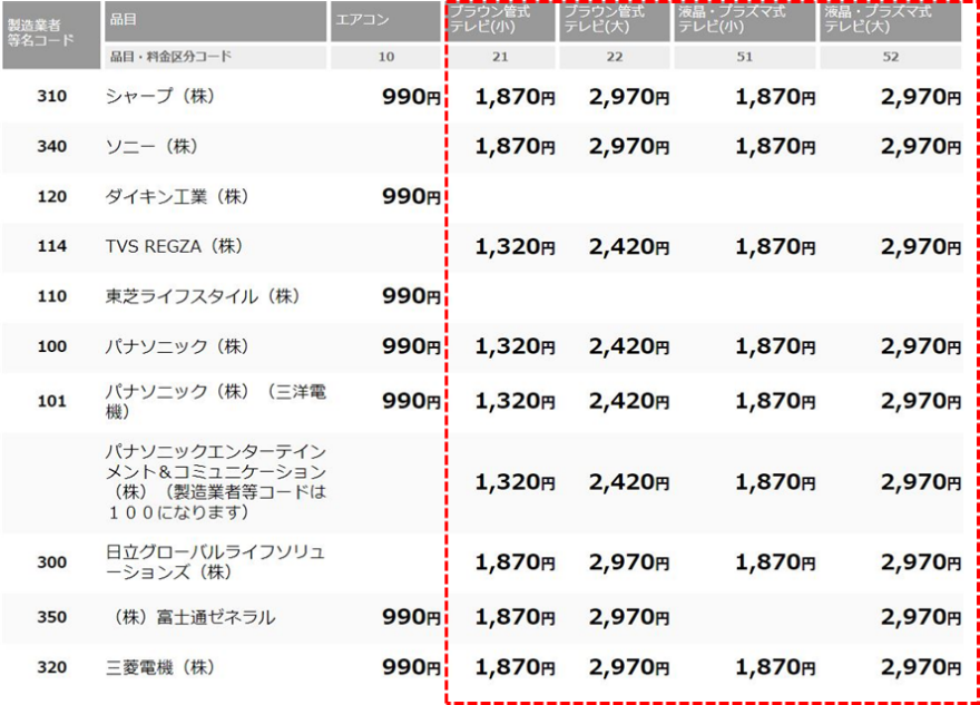 リサイクル料金はテレビのメーカと画面サイズによって異なるので、事前に調べておきましょう。