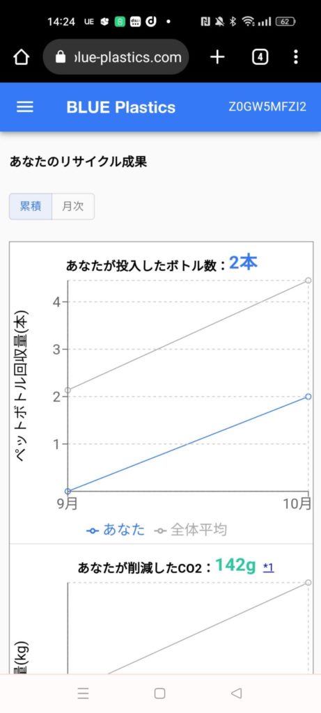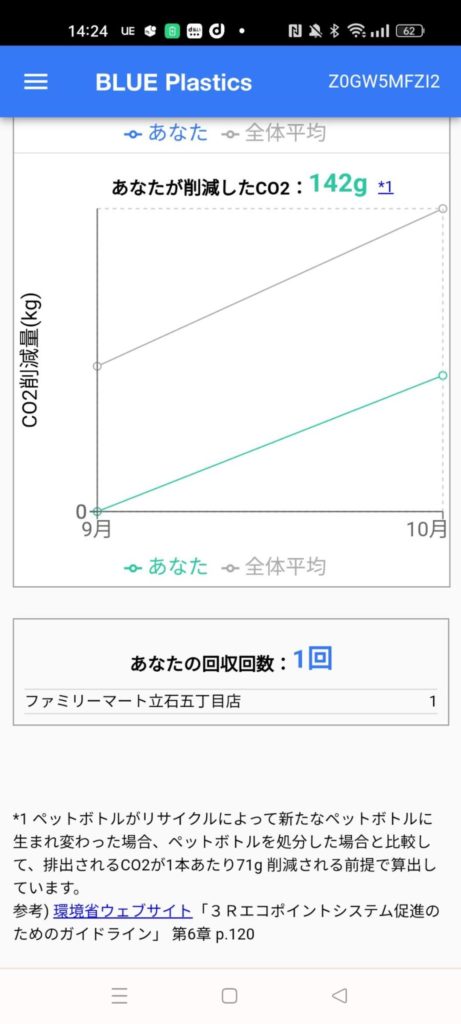 さらに、左上の三本線のボタンを押して「あなたのリサイクル成果」に行くと、これまで投入したボトル数、削減したCO2の量、ボトルを投入した回数を確認することができます。