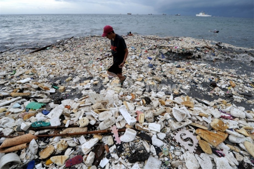 フィリピン・マニラ湾に打ち寄せられたゴミの山。容器やマットなど、おびただしい量のプラスチックゴミが散乱している。