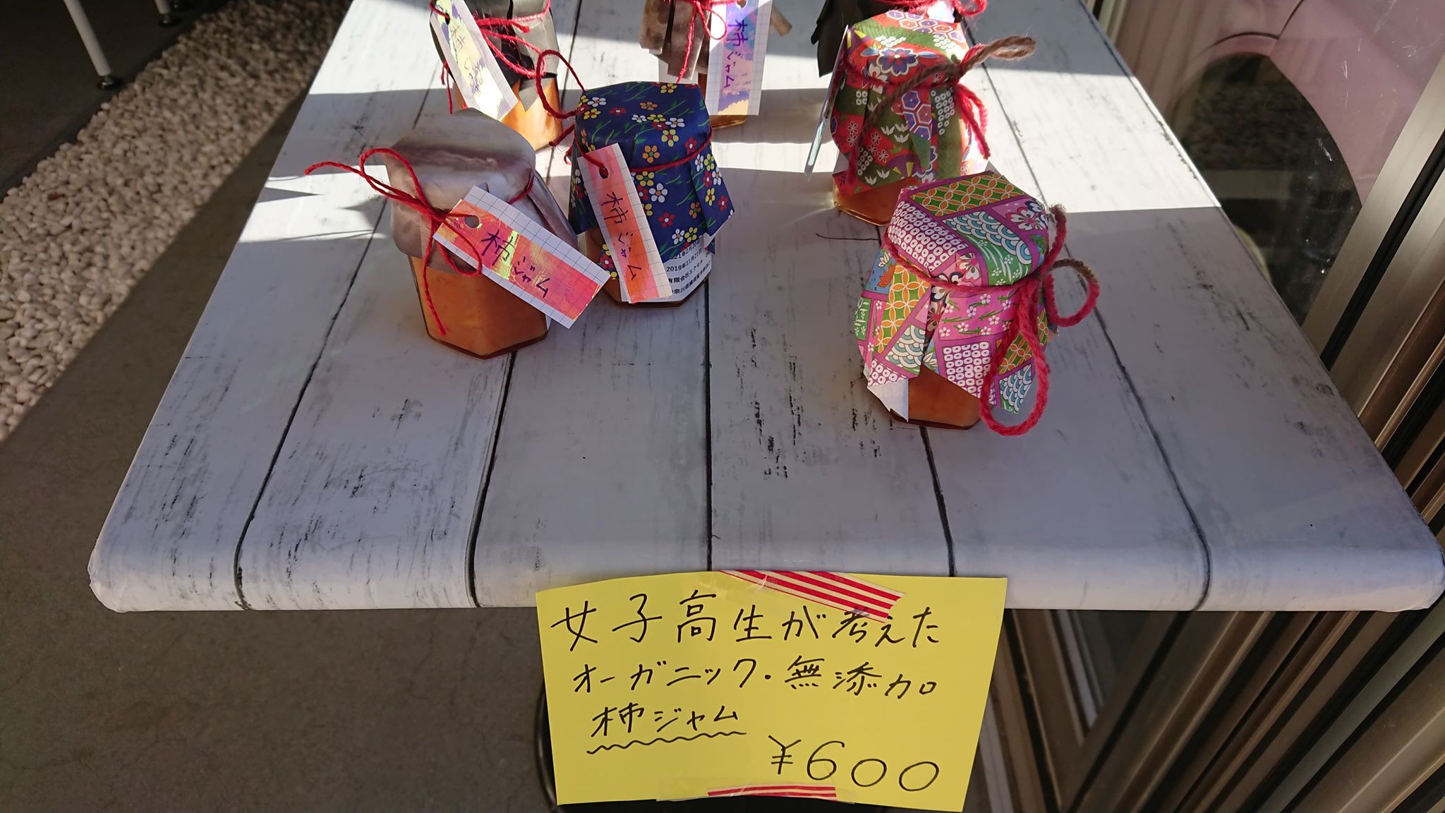「学生が考えた フードロス 柿ジャム」という段ボールに手書きのボードが。