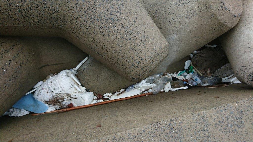 テトラポットの合間にたくさんのPETボトルです。とるだけでも大変です。