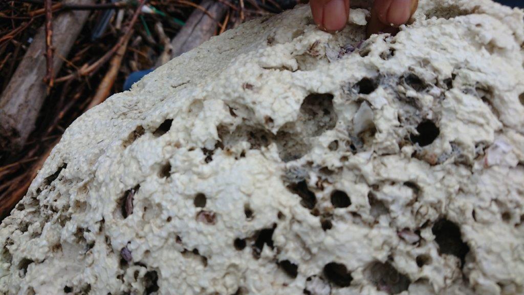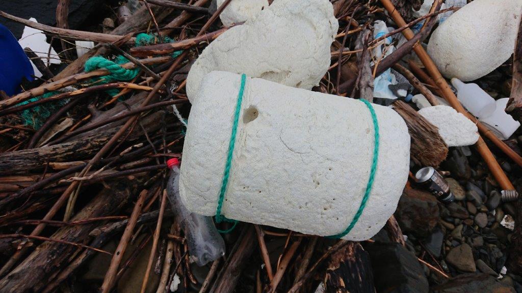 発泡スチロールがこのように劣化していると、砂が中に入り込み、リサイクルの妨げになる。