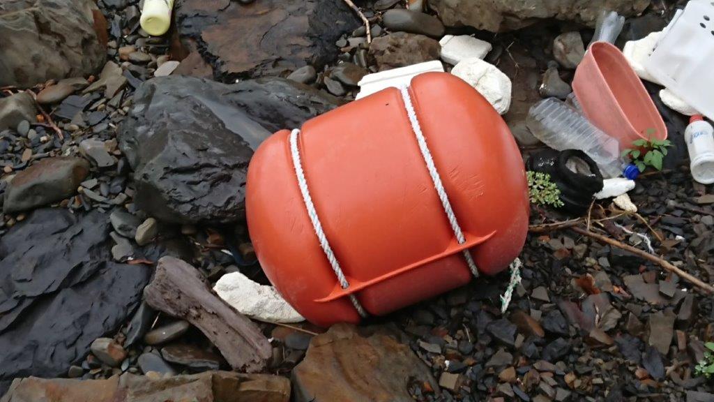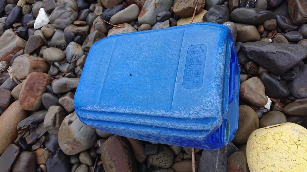ポリタンク(青) 韓国のノリ消毒で使われるもの。おそらく故意に海に投棄されている。海水が入っても浮くので遠くに流れ着きます。これも多いです。そして、これが一番リサイクルしやすいアイテムです。