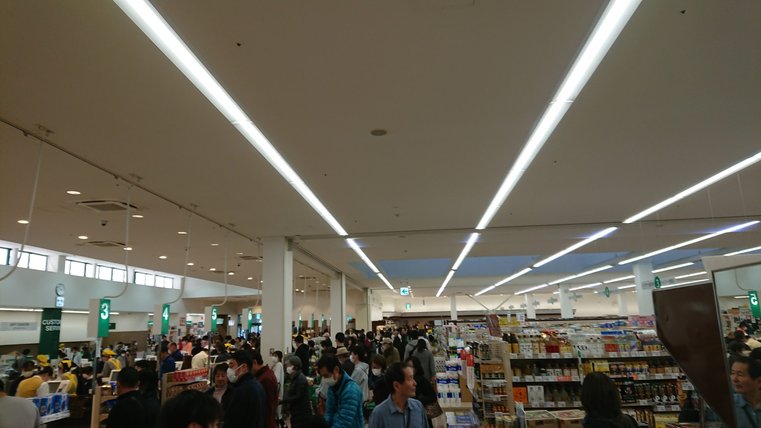 当然店内も大混雑。まるでGWやお盆のときの混雑のようです。レジも一つのレジに二人づつついて、臨戦態勢です。(写真上)
