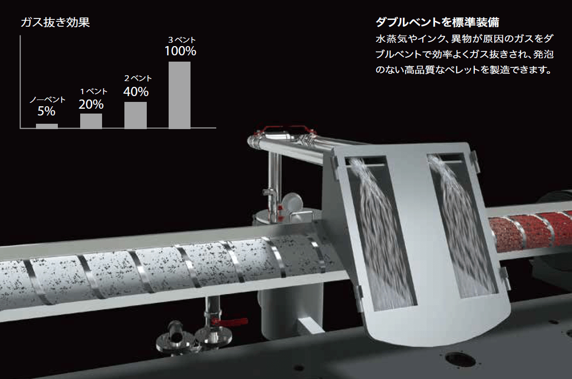ベントがあると、ベント経由で押出機のシリンダー内部から水蒸気やガスが抜けるため、造粒時に巻き込んだ空気もベントから抜くことが可能となります。