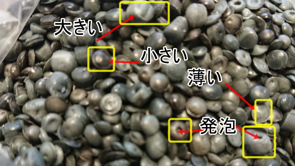 - 発泡:小さな気泡が大量に発生し、ペレット表面がガサついた状態になることが多い。