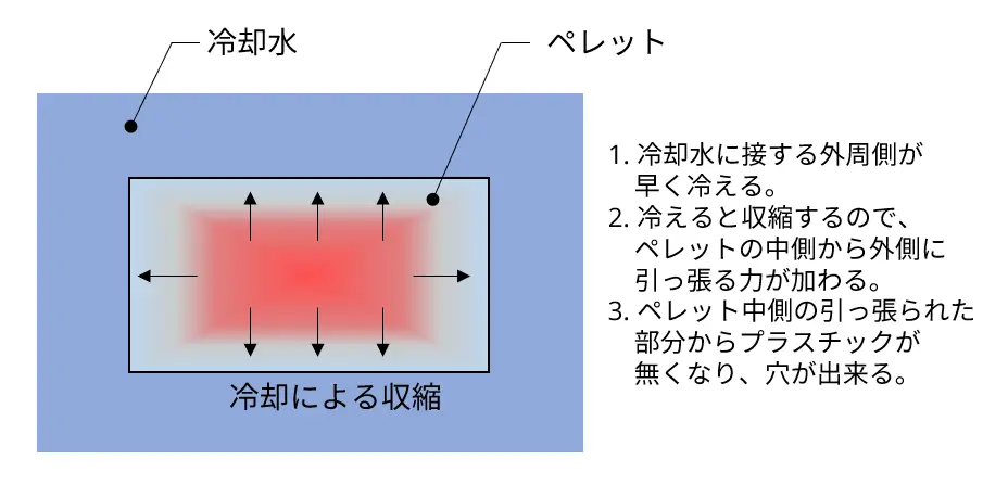 ペレットの中心付近に1か所だけ貫通穴が開く場合があります(真空泡)。これは、押出機から出てきたストランドやペレットが冷えて固まる際、外側から固まるためにプラスチック内外で収縮バランスが崩れ、中心部に穴が開くためです。