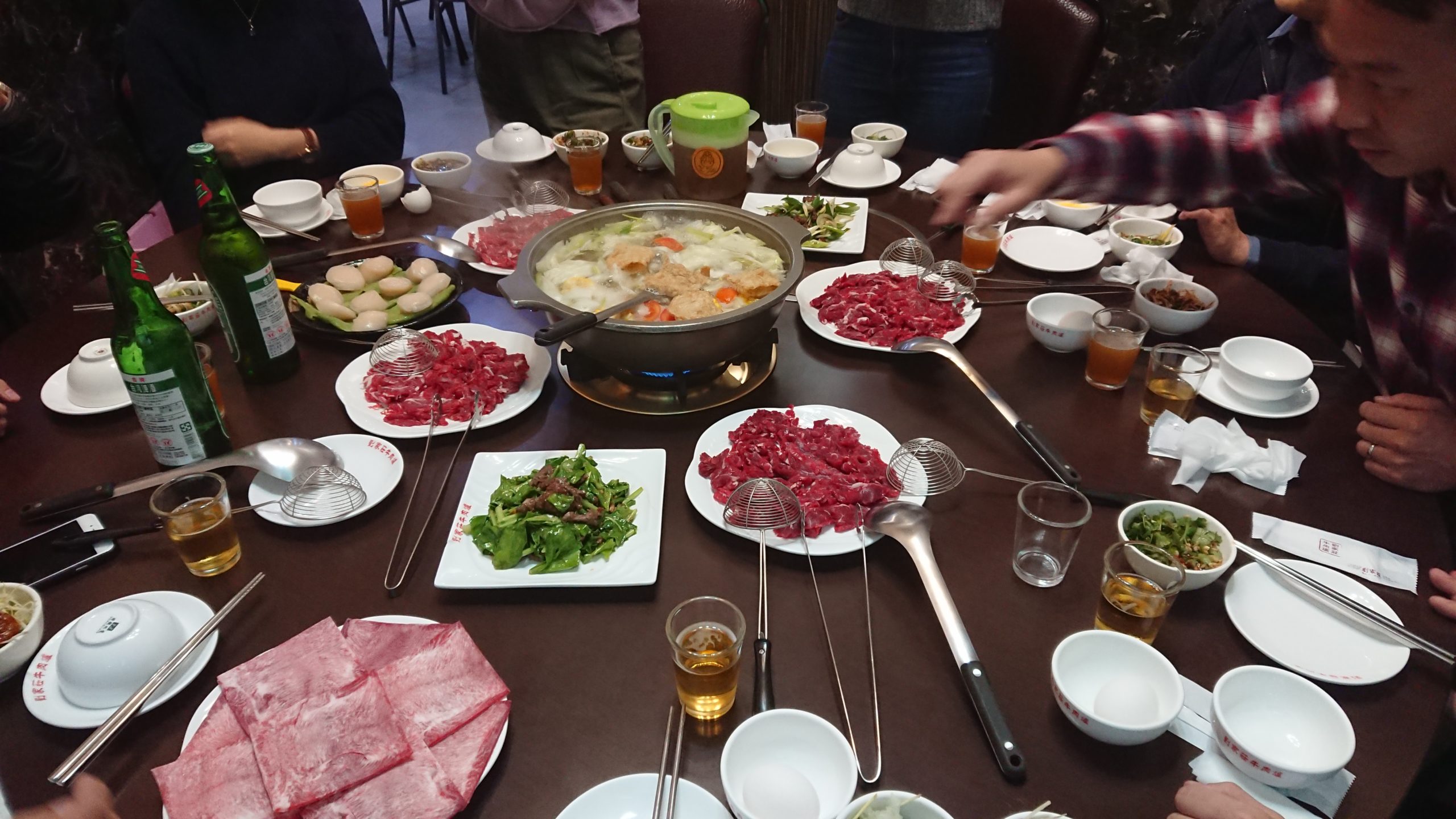 牛肉はしゃぶしゃぶのような感じでいただくのですが、 日本ではお箸でしゃぶしゃぶしますが、こちらは金属 でできた網に牛肉を入れてしゃぶしゃぶします。
