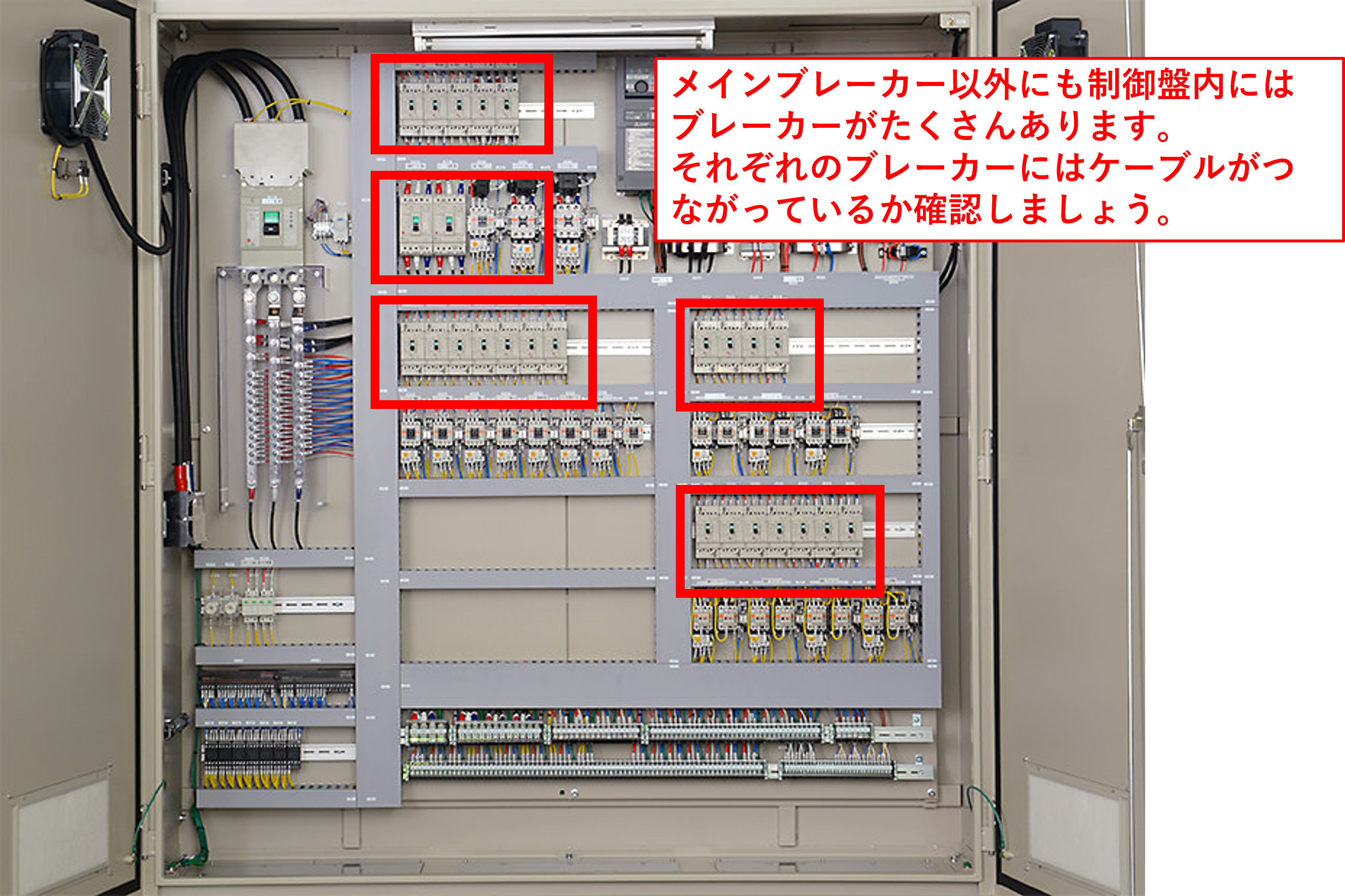 その場合は、制御盤に電源を供給している分電盤や電気室内のブレーカーがONになっていない可能性が高いです。