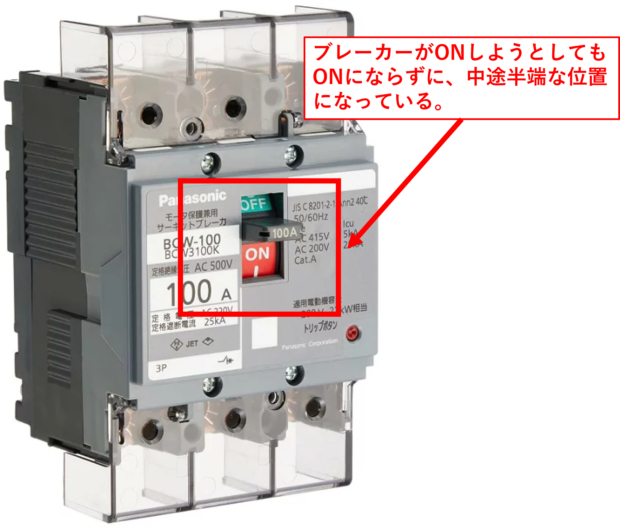 具体的には、以下の写真のようにブレーカーがONとOFFの間にあるような状態です。