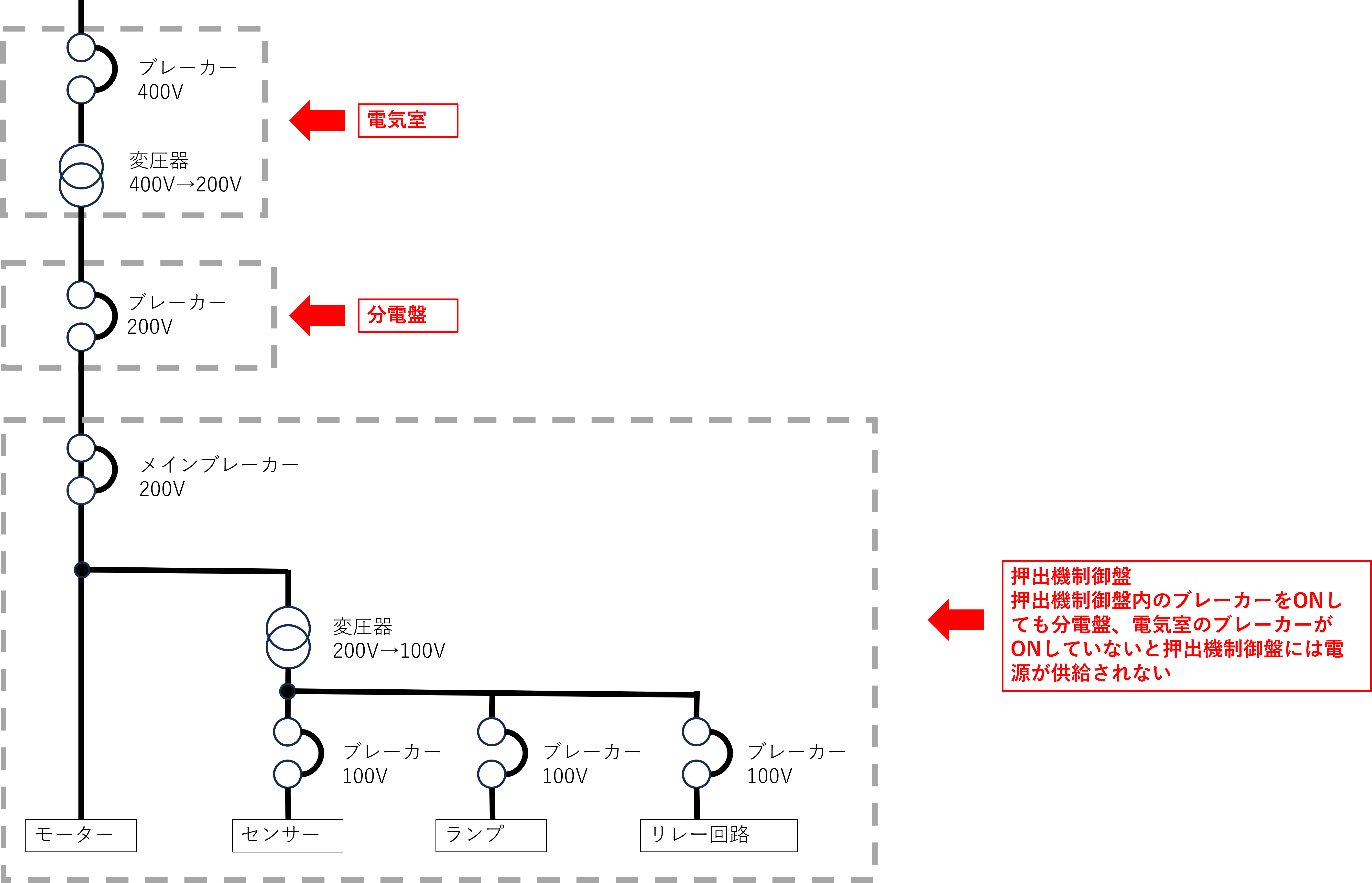 先ほどの電源系統の場合は、押出機制御盤のメインブレーカーがONになっていても、分電盤や電気室内のブレーカーがONになっていない限りは、制御盤には電源が供給されないということがわかります。