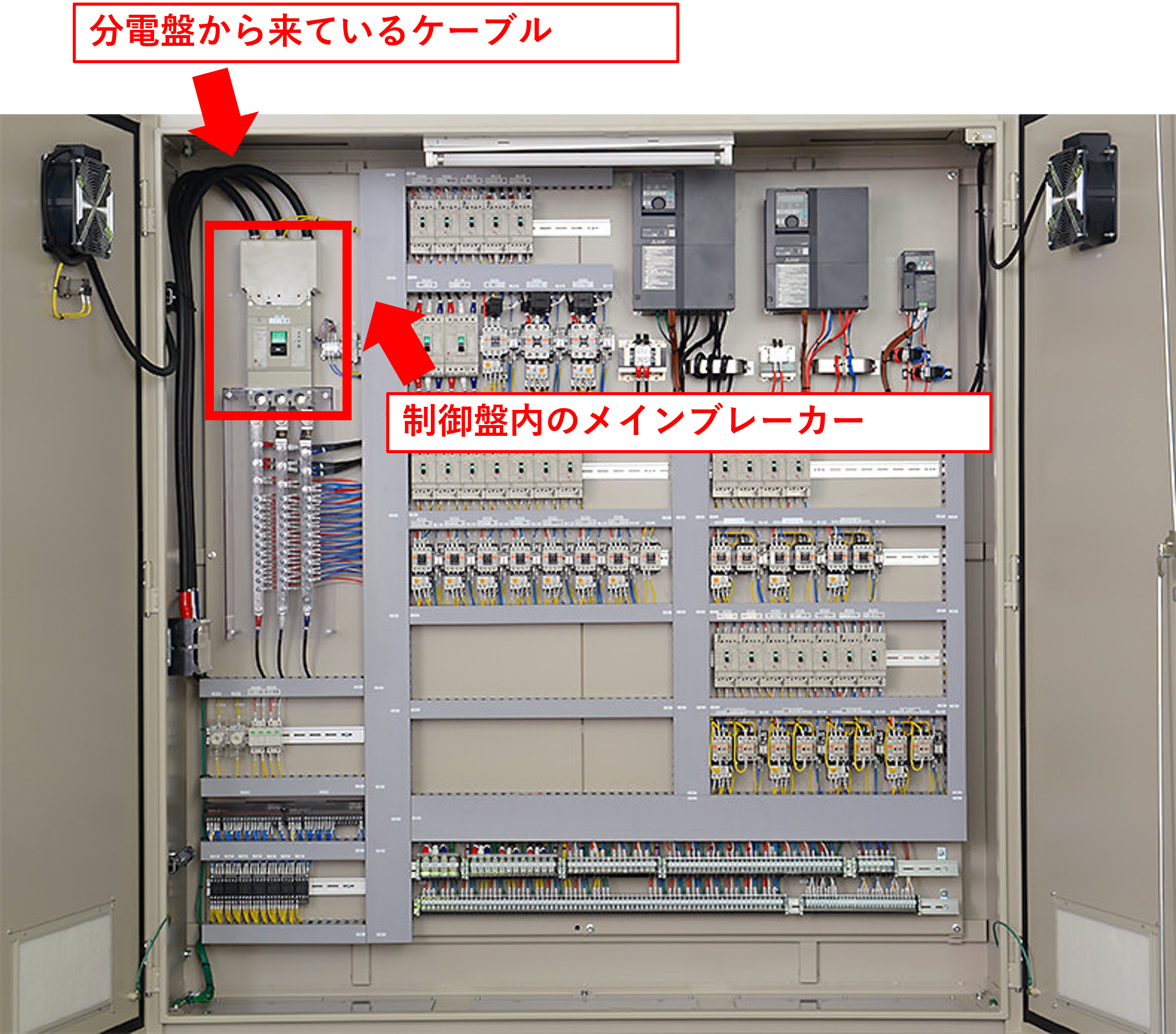 制御盤内のメインブレーカーへのケーブルはあなたの工場で接続しますが、そのほかのブレーカーは制御盤を作っている業者が製作時にケーブルを接続します。