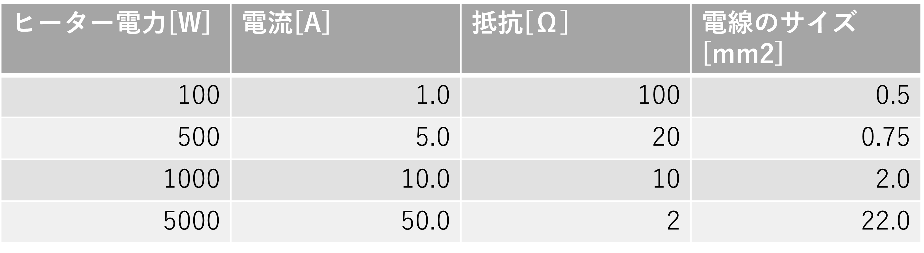 上記の表(電源電圧100Vの場合)では、電圧100Vをかければ1000W出力される抵抗(ヒーターそのもの)を選定し、その時には電流10Aが発生するという読み方になります。